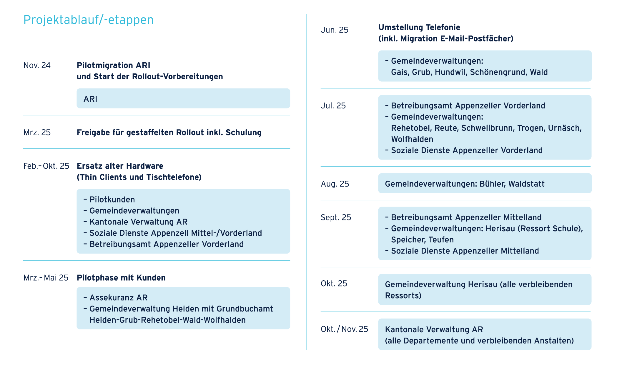 Anschliessend folgte ab Juni 2025 zur Risikominimierung die Migration der weiteren Verwaltungseinheiten. Die Reihenfolge wurde basierend auf der Anzahl betroffener Arbeitsplätze festgelegt. Dieses Prinzip wurde zudem für die Gemeinde Herisau und die kantonale Verwaltung angewandt. Am 14. November 2025 wurde der letzte Standort migriert. Alle Verwaltungseinheiten im Kanton telefonieren seitdem über Microsoft Teams.