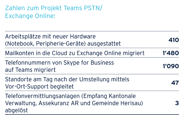 Vor dem Rollout bei ersten Kunden wurden die Teams-Telefonie und Exchange Online während 10 Monaten innerhalb der ARI pilotiert. In einer nächsten Phase erfolgte ein Rollout im Sinne eines Pilotbetriebs in der Assekuranz AR und der Gemeinde Heiden. Die Rückmeldungen dieser beiden