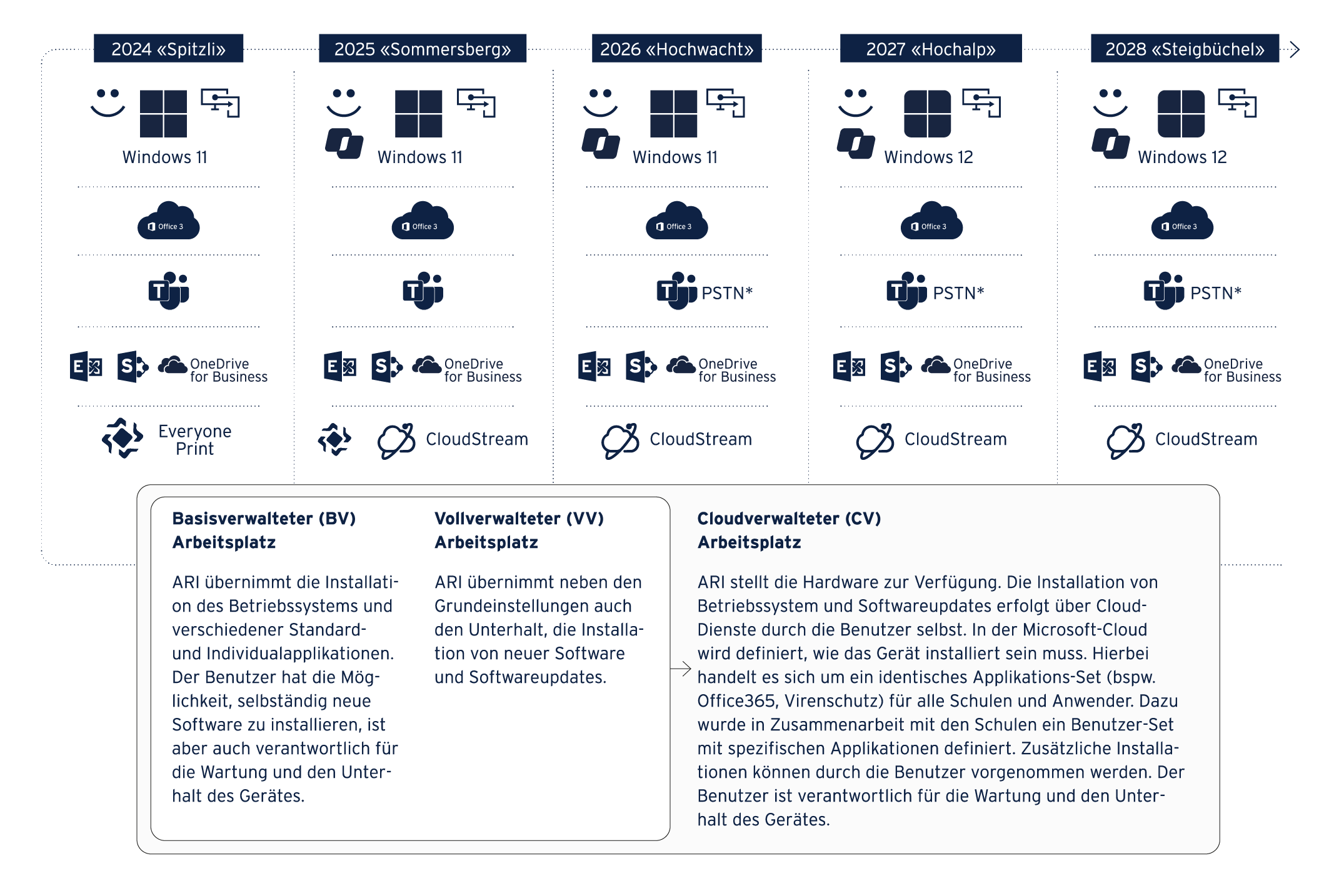 Basierend auf dem Ansatz des «lean management» und mit dem Ziel einer Harmonisierung bzw. Standardisierung angebotener Services wurden seit 2023 schrittweise alle basis- oder vollverwalteten Arbeitsplätze in cloudverwaltete Arbeitsplätze überführt. Im Jahresverlauf 2025 wurden die letzten vollverwalteten Geräte ersetzt. Auf sämtlichen Arbeitsplätzen wird die Software zentral über die Cloud bereitgestellt und verwaltet. Neben einer Kostenreduktion für Bereitstellung und Unterhalt der Hardware bietet diese Lösung für die Anwenderinnen und Anwender mehr Flexibilität hinsichtlich der genutzten Software – beides zentrale Faktoren für die Volksschulen in Appenzell Ausserrhoden.